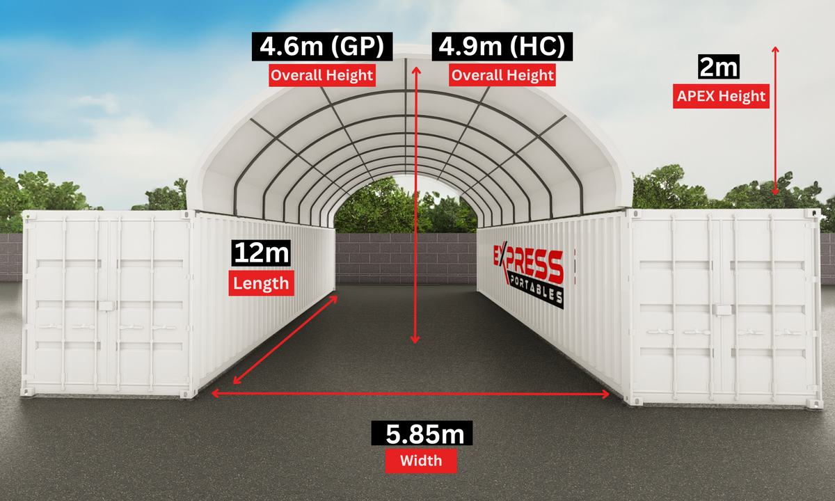 Download our Dimensions Guide for all the dimensions on our Container Domes & Shelters. Widths ranging from 20ft to 60ft.