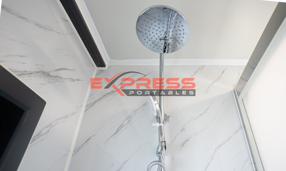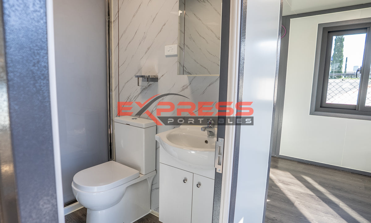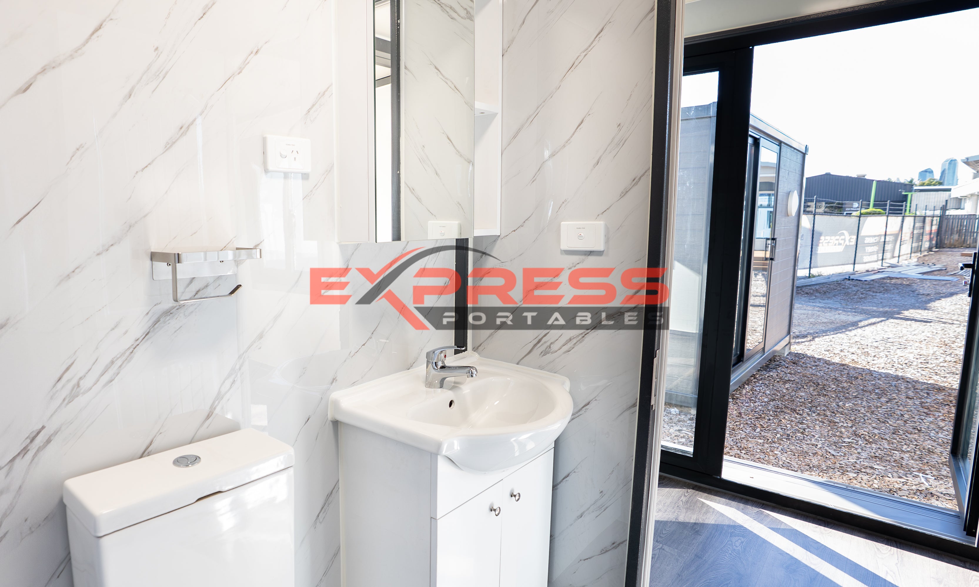 Toilet waste penetrates through the floor. When the building is installed on to footings, Subfloor clearance access is required underneath for a plumber to connect the water and waste pipes.