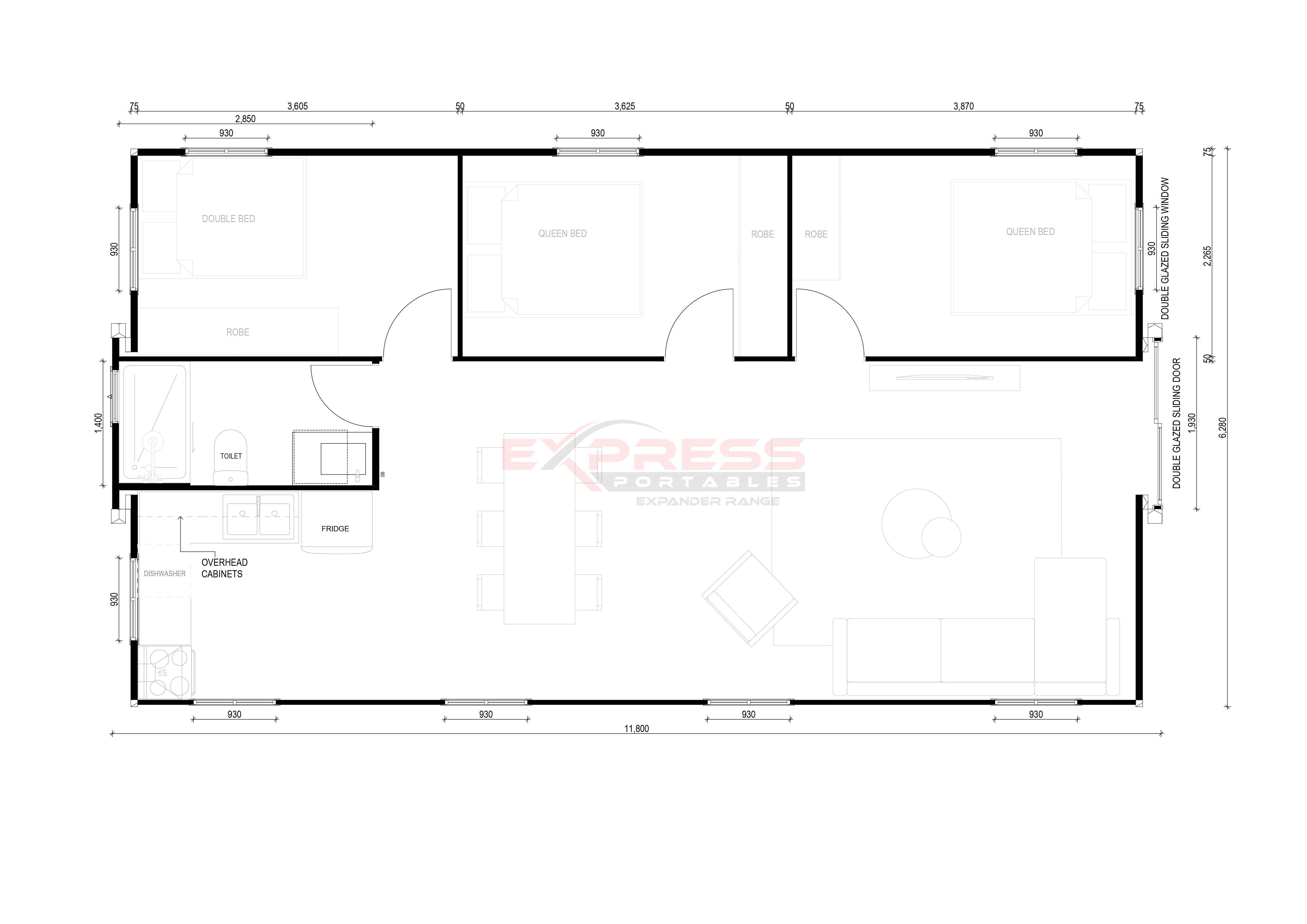 Constructed with a structural steel frame treated with epoxy and acrylic paint for enduring resilience against corrosion and wear, our three-bedroom fold-out home stands as a testament to robust construction. The walls are made from 75mm EPS sandwich panels and the roof uses 50mm EPS panels.