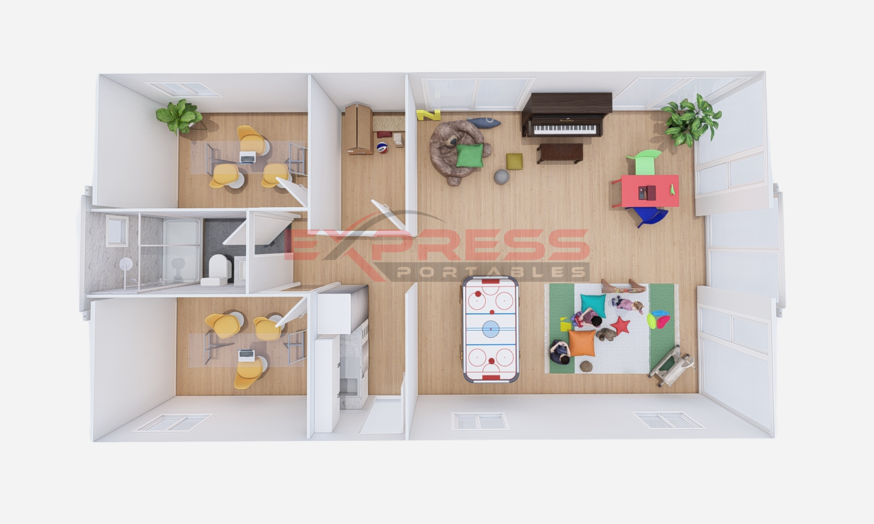 Water and waste lines provided to kitchen sink for easy connection after opening the building