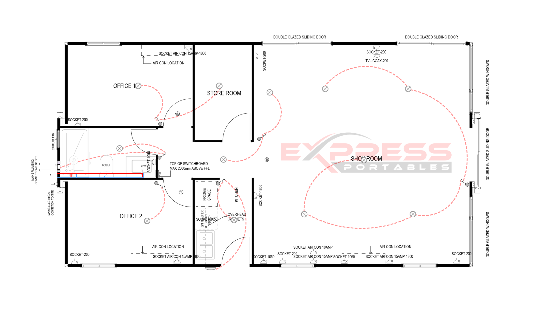 All lights and switches are pre-wired inside walls. Fit off of points required after opening and installing the building