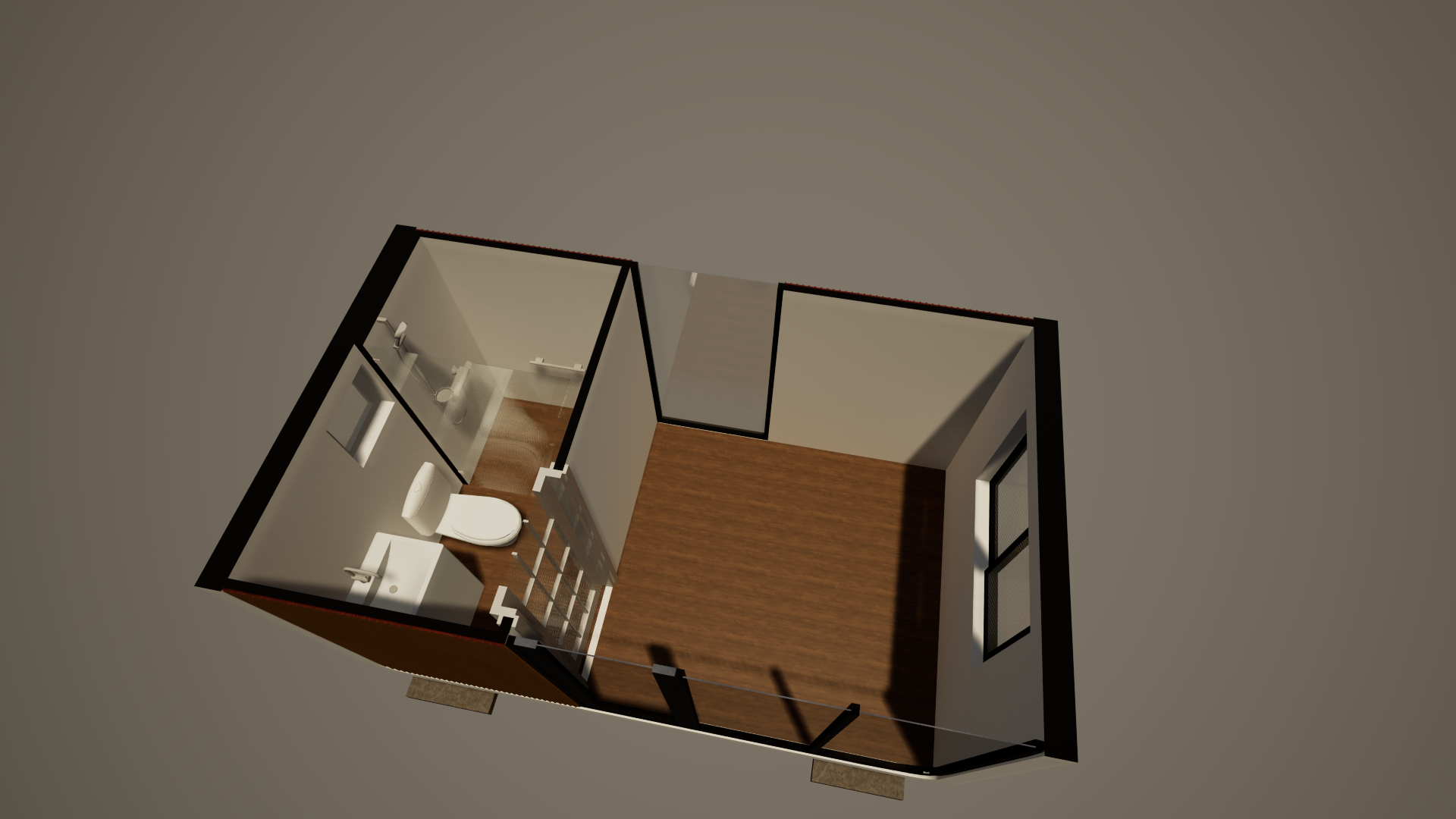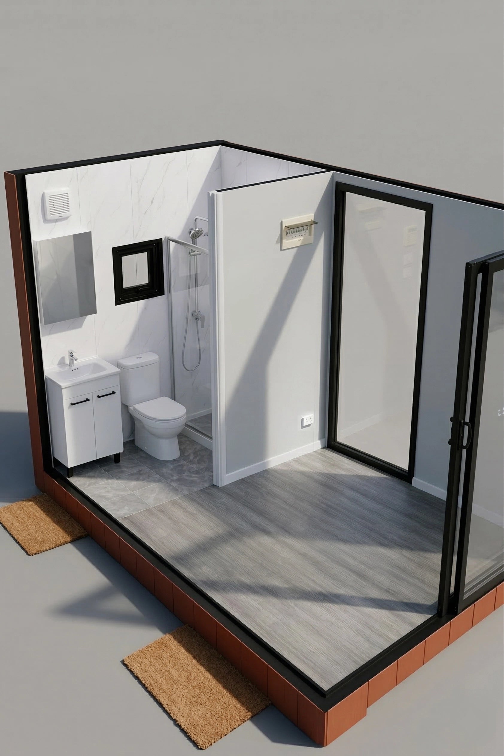 One of the standout upgrades in the Designer range is the full-size bathroom layout. Instead of a combined wet bathroom like those in the original Spacee, the Designer Spacee features a separate shower, toilet and vanity, creating a far more functional and comfortable space for everyday use. Premium finishes such as marble-look wall panels, a dual shower system and tiled flooring elevate the bathroom beyond typical modular accommodation.