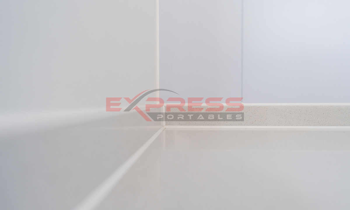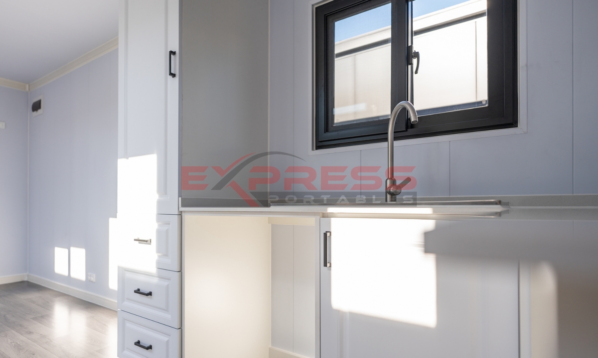 The utility includes a mini kitchenette with a sink and cabinets. Featuring a smooth 20mm quartz counter (0% Silica) with a stainless steel sink and chrome fittings. It also comes with provisional space for a fridge and dishwasher.