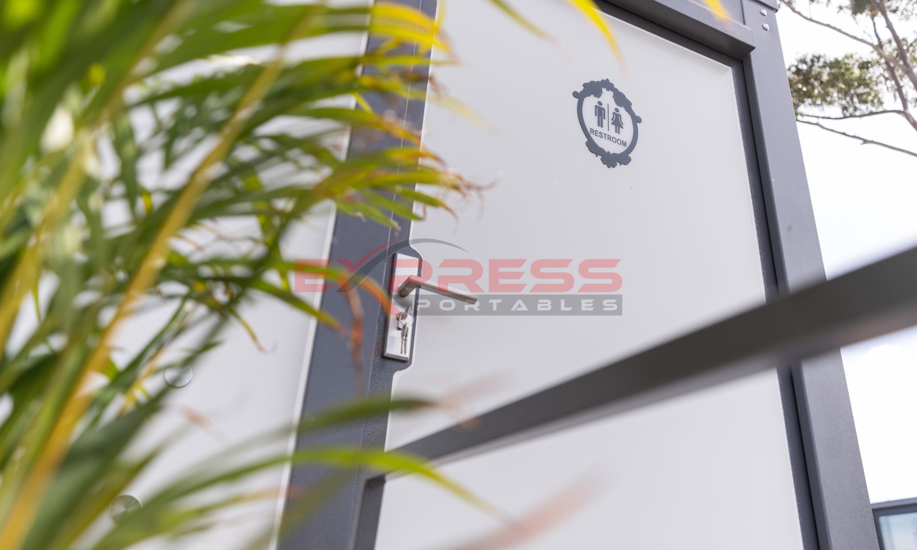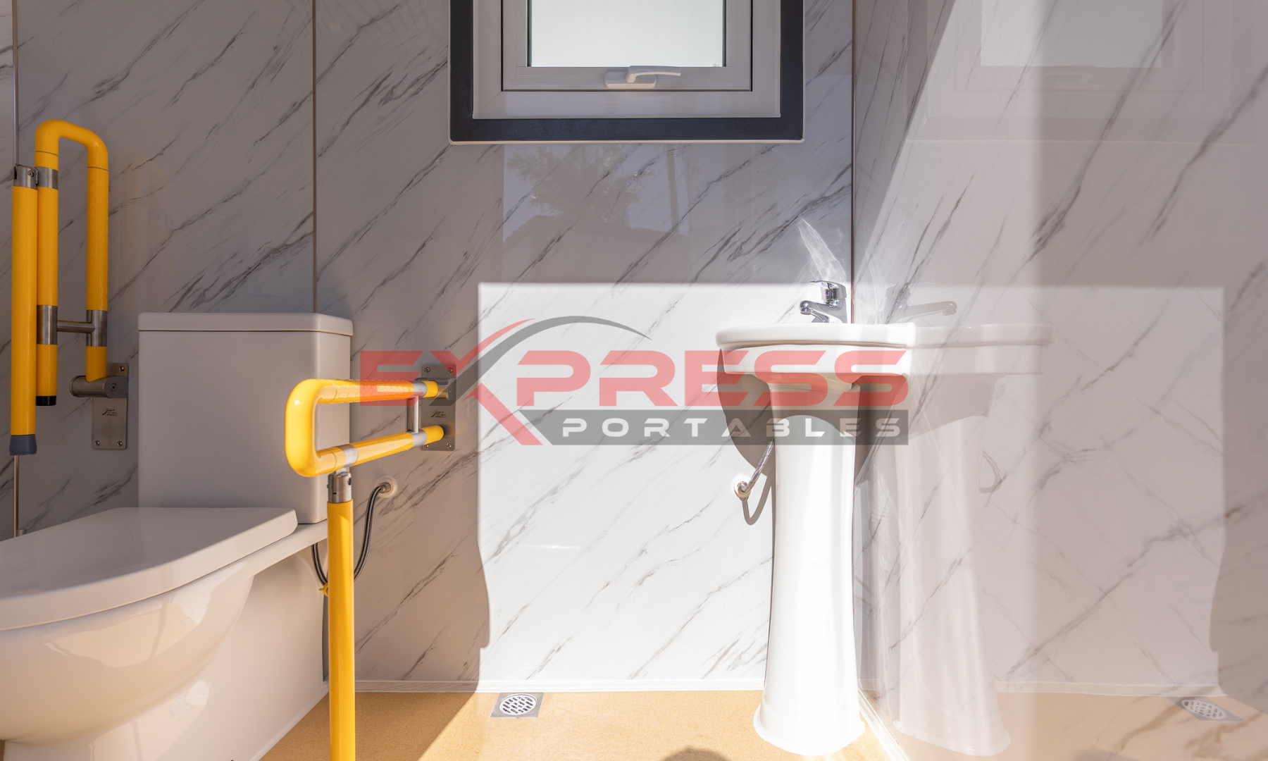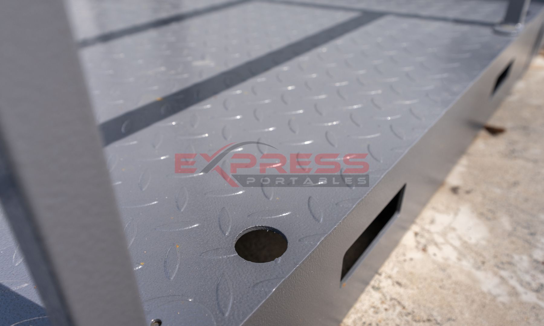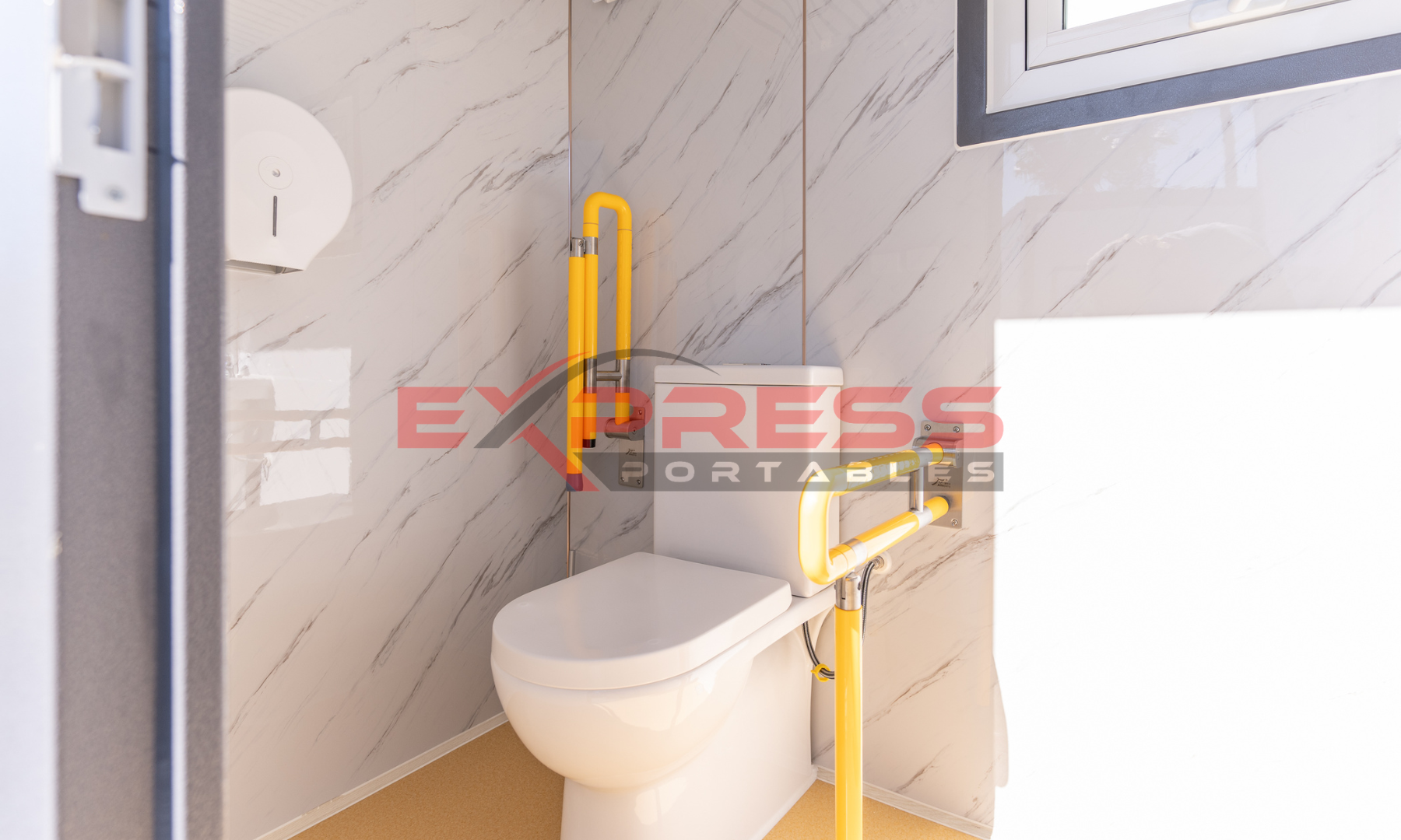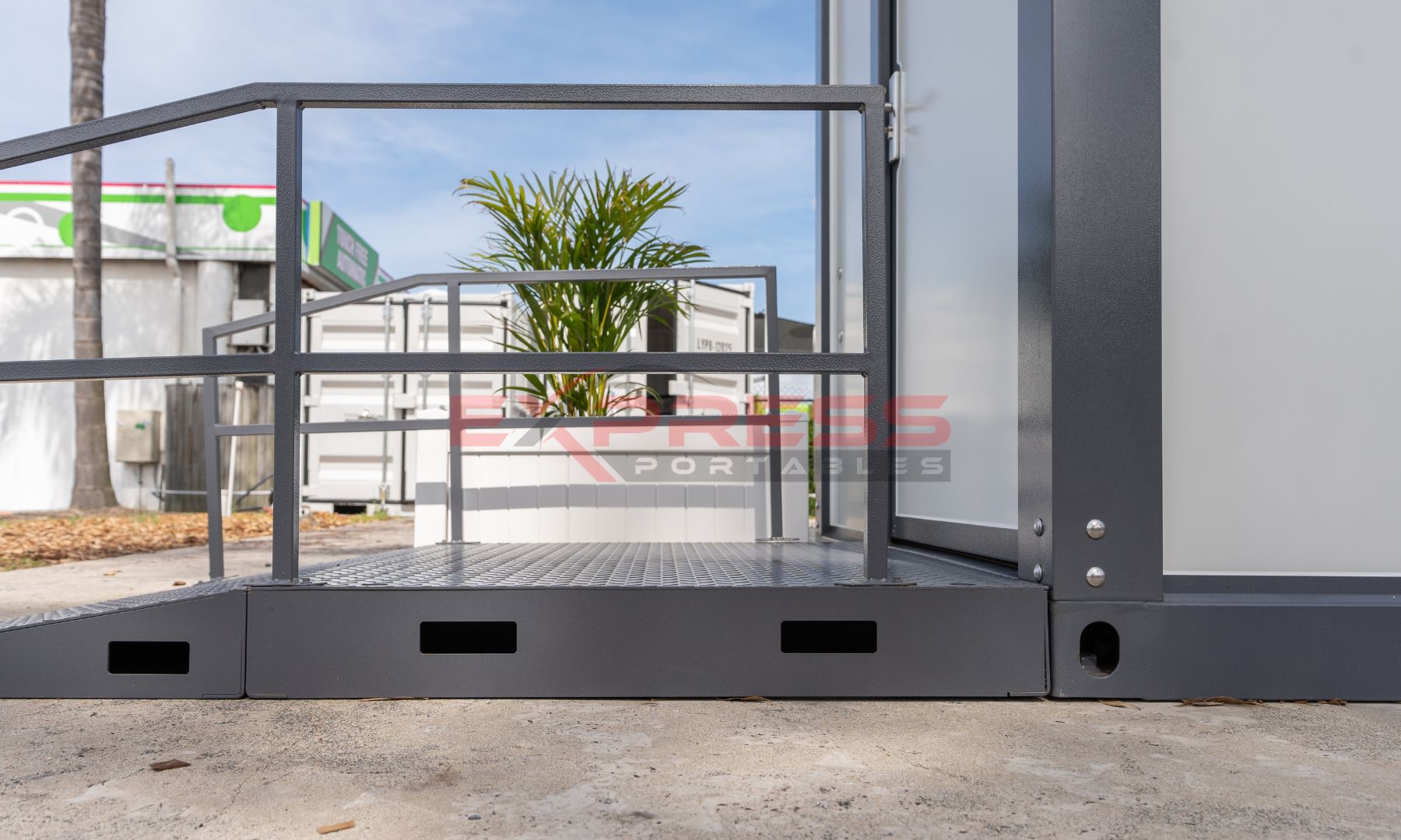 The inclusion of forklift pockets on the ramp of the portable toilet enhances its mobility and ease of transport.