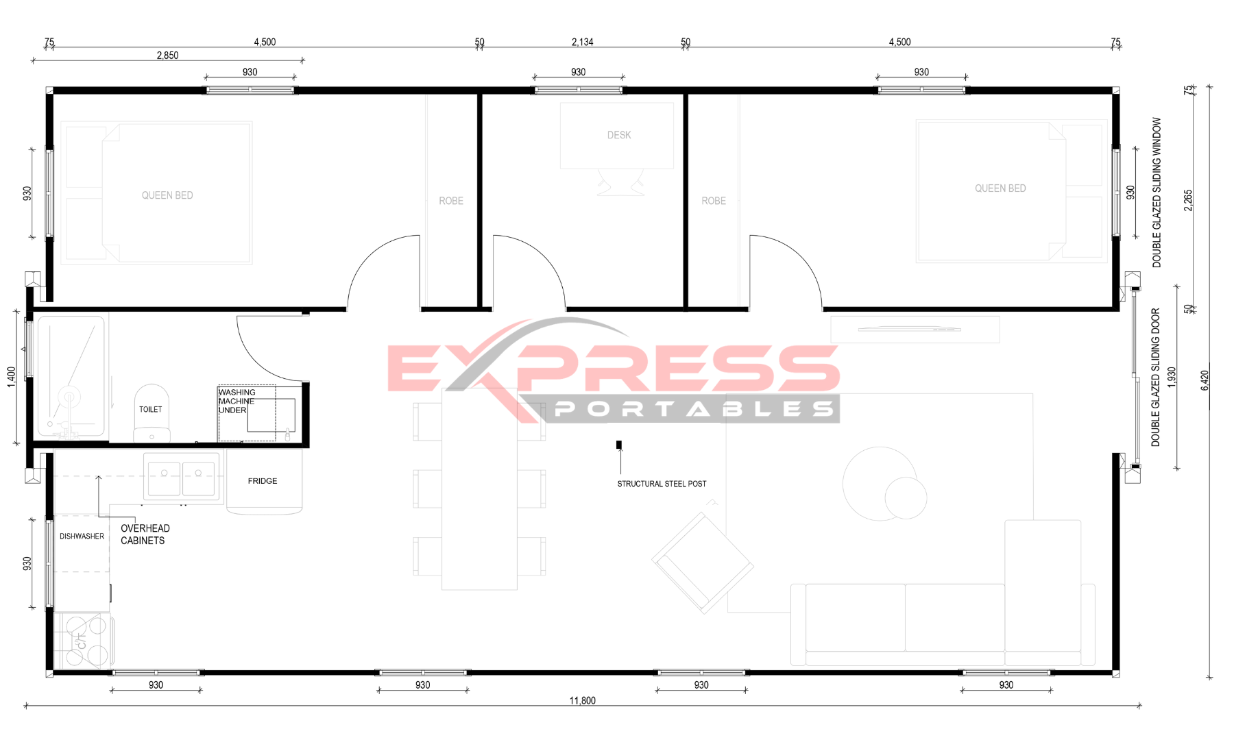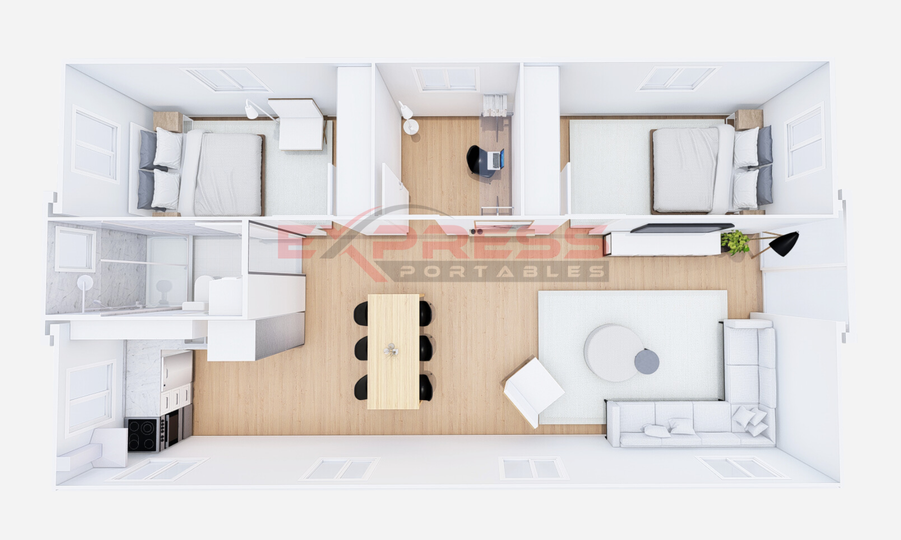 Constructed with a steel frame treated for enduring resilience, the two-bedroom portable home & office comes with a built-in office area. The walls use 75mm EPS sandwich panels and the roof uses 50mm EPS panels. Its glass and lockable aluminium entry door ensure security while welcoming natural light. Aluminium double-glazed windows enhance ventilation and insulation, elevating the contemporary design.