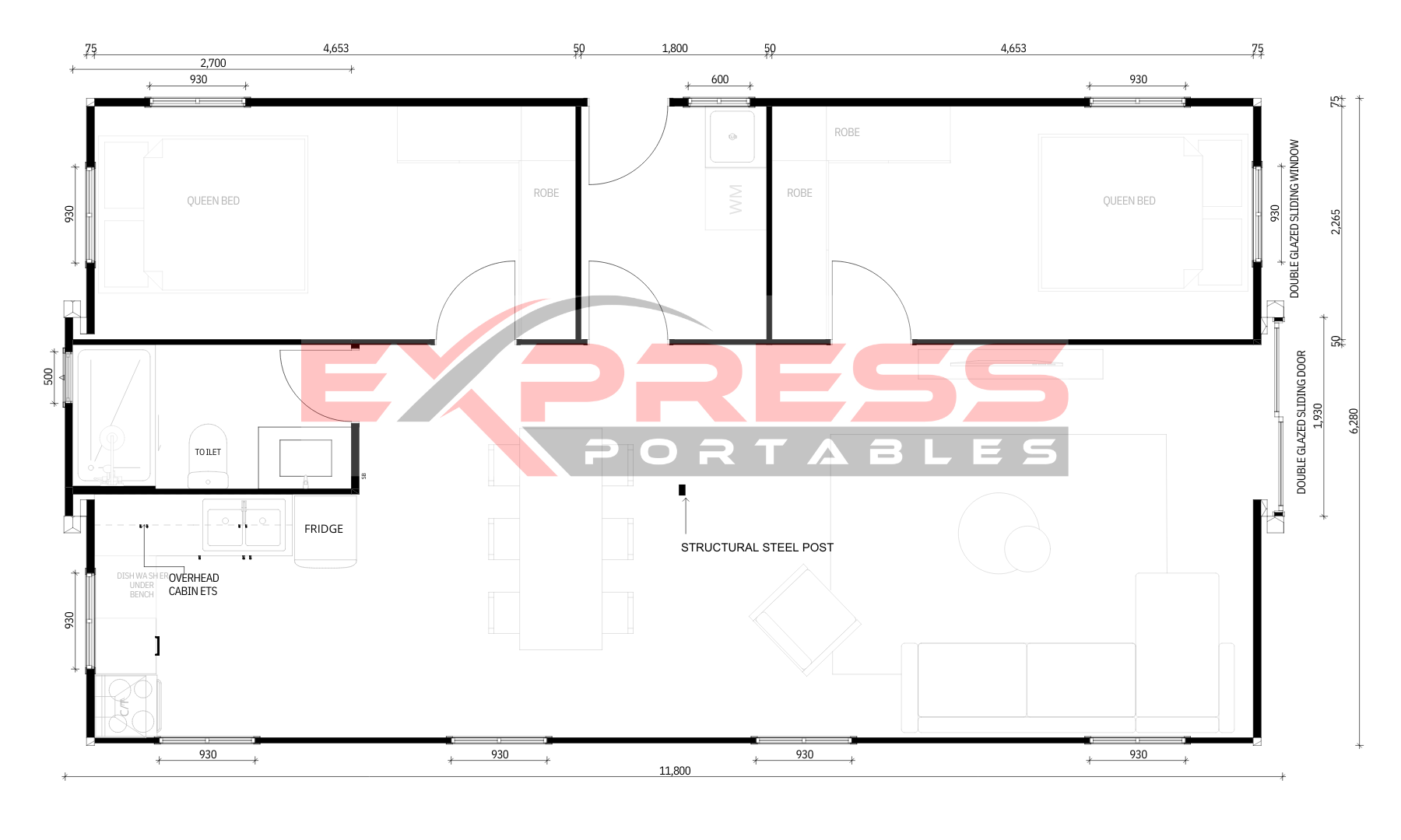 Constructed with a structural steel frame treated with epoxy and acrylic paint for enduring resilience against corrosion and wear, our three-bedroom fold-out home stands as a testament to robust construction. The walls use 75mm EPS sandwich panels and the roof uses 50mm EPS panels.